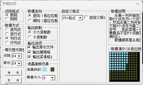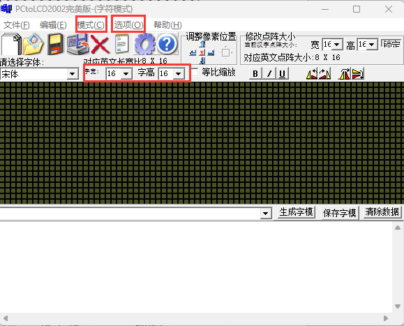 模式我们选择字符模式,宽高选择16*16,也就是一个汉字所占的像素点的大小。在选项中,我们需要配置一些参数,具体配置参数如下。