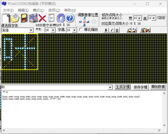 参数确定之后,我们就可以生成想要生成的汉字或字符的字模数据了,比如我们想生成“叶”字,直接在输入框中输入叶,然后点击生成字模。