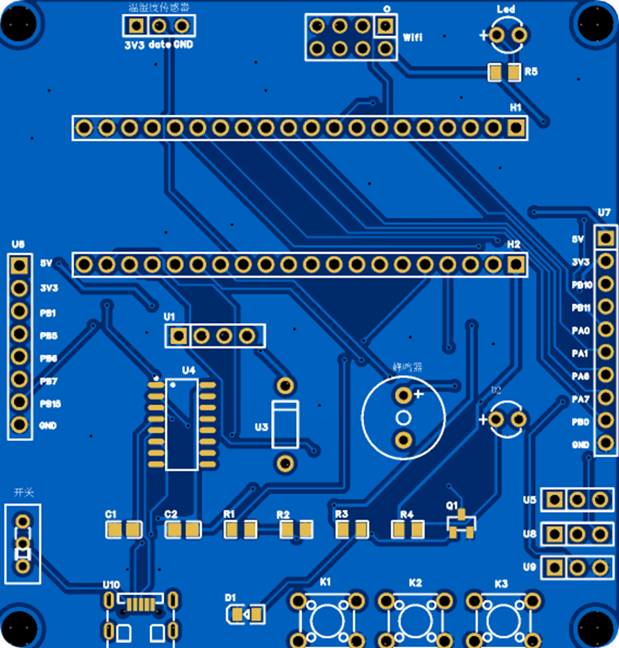 项目中用到的PCB如下图所示,在PCB板上我们集成了下载电路和各种LED、蜂鸣器等模块。方面大家跟着视频去学习调试,避免遇到一些环境上的问题。